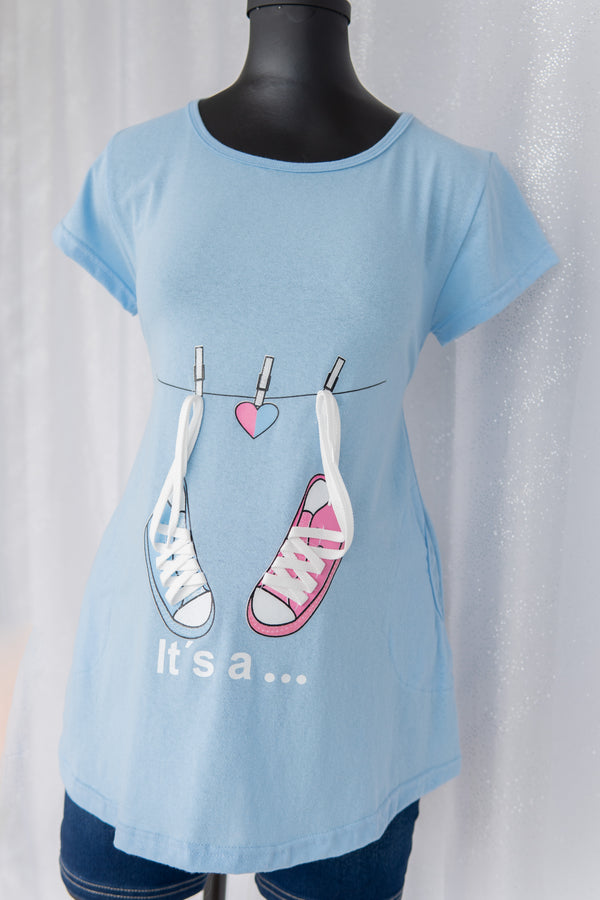 Playera de Maternidad Gender Reveal "Boy or Girl" con ajustador en espalda para dar figura. Elaborada en algodón con agujetas de imagen en 3D.
