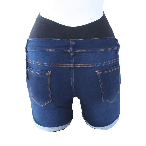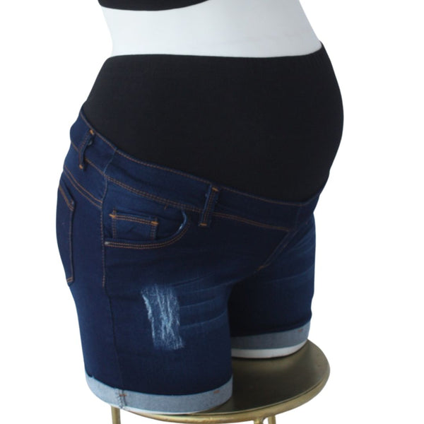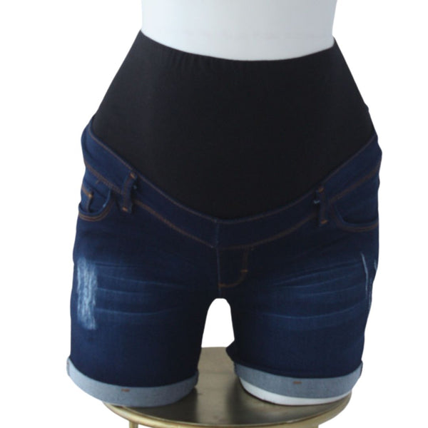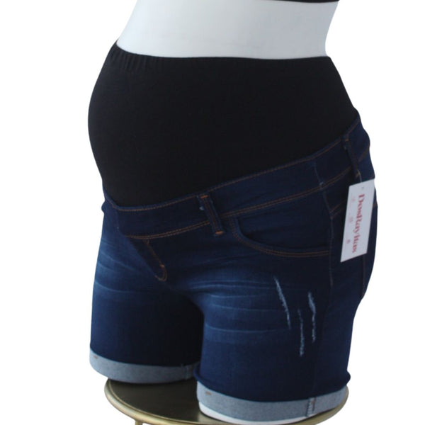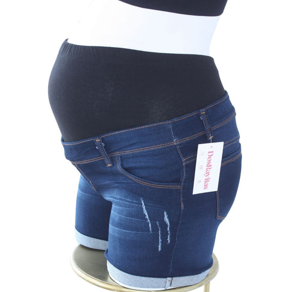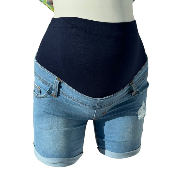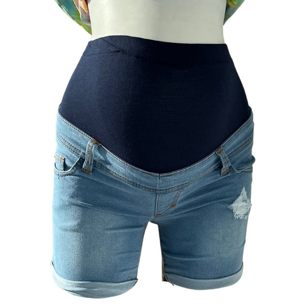 Lista en todo momento con este cómodo short de maternidad elaborado en mezclilla con panza alta.