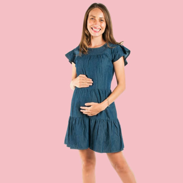 Bella en todo momento con este Vestido de maternidad elaborado en mezclilla ligera con elástico en espalda. Luce siempre cómoda y a la moda con este vestido.